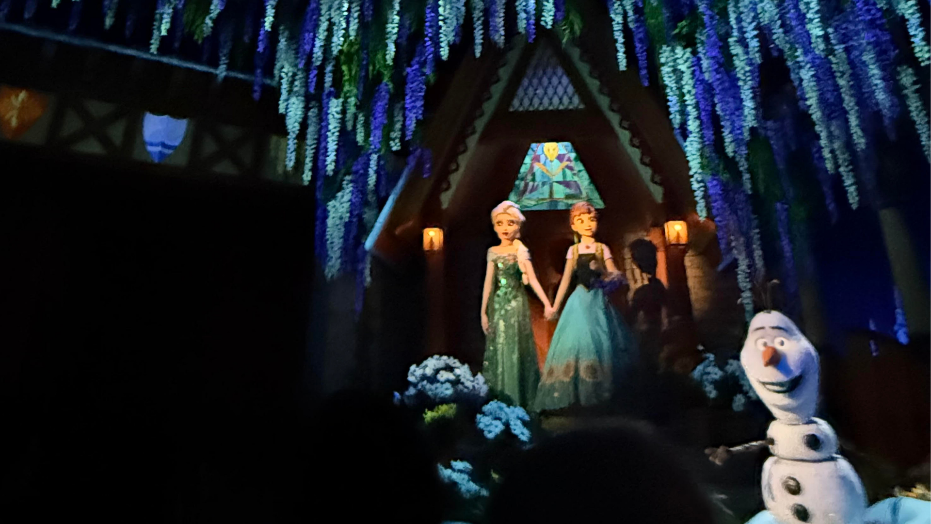 엘사가 유배되어 얼음 궁전을 짓는 산이 <겨울왕국의 세계>의 중심이 된다. 그 기지는 내가 방문한 날 공원에서 가장 긴 줄이 있었던 새로운 “Frozen Ever After” 뮤지컬 보트 탑승구의 입구입니다.